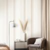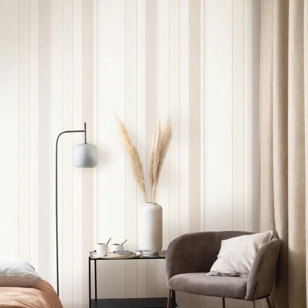 Otro modelo de papel pintado tradicional actualizado: el efecto bayadera se moderniza inmediatamente con reflejos, colores nacarados, líneas metalizadas.