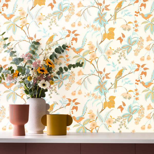 La naturaleza nos llena de felicidad. Basta con mirar este estampado que combina pequeños pájaros y pequeñas flores, que cobra vida con colores vivos desde los más suaves hasta los más atrevidos