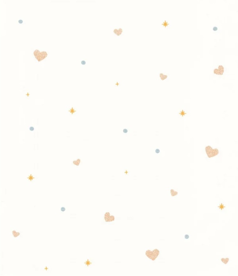 Corazones diminutos, estrellas diminutas, dibujos diminutos. Este papel pintado juega con la sencillez de un fondo claro y liso, pero conserva la fantasía de estos pequeños dibujos, como si estuvieran garabateados