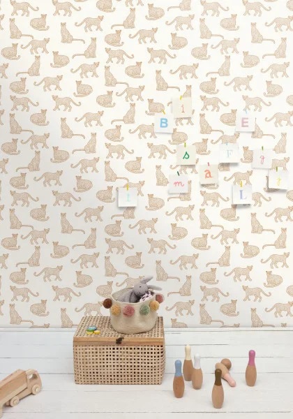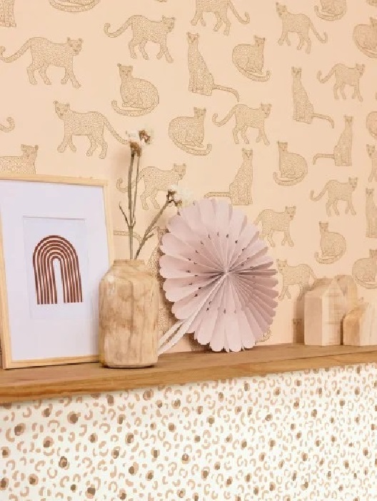 Podemos encontrar un leopardo de tamaño superior al natural, en multitud de estampados con un bonito efecto metalizado sobre un fondo liso. Nos recuerda a viajes aventureros en medio de la naturaleza.