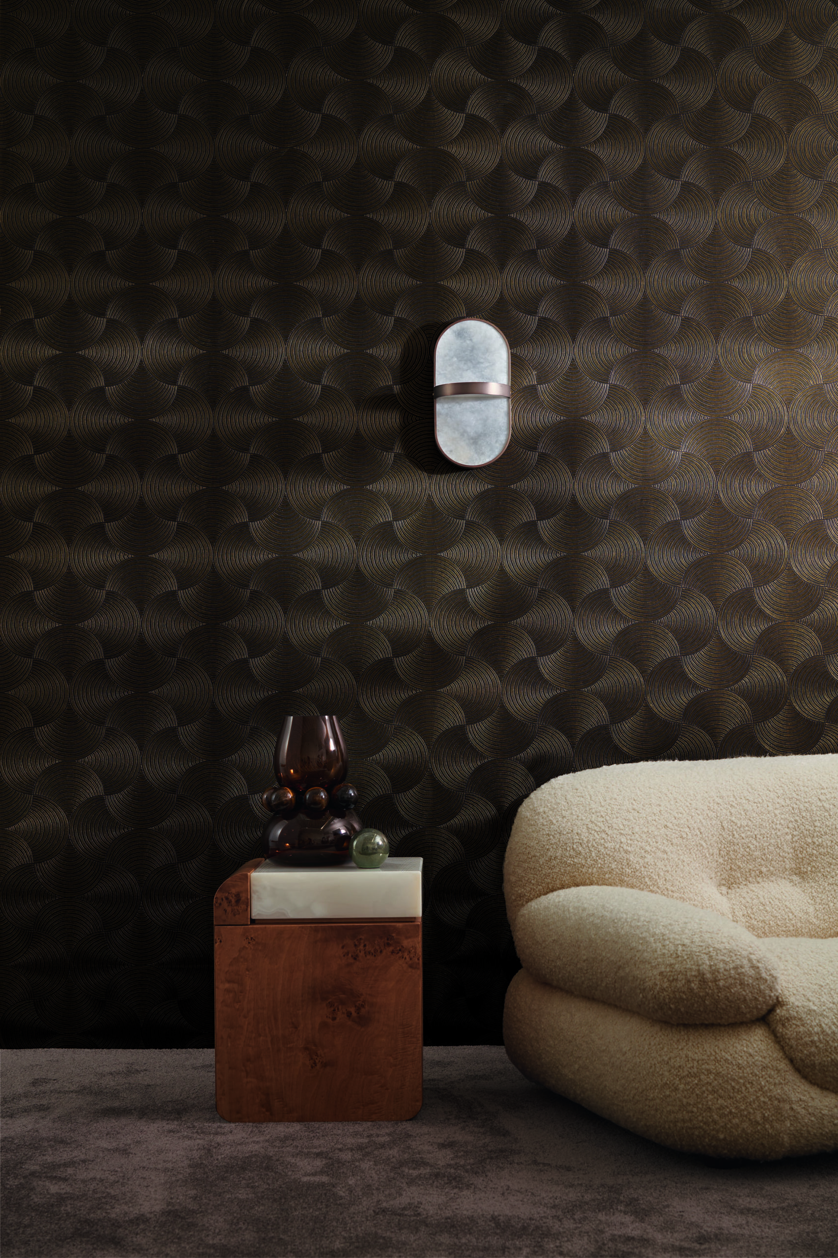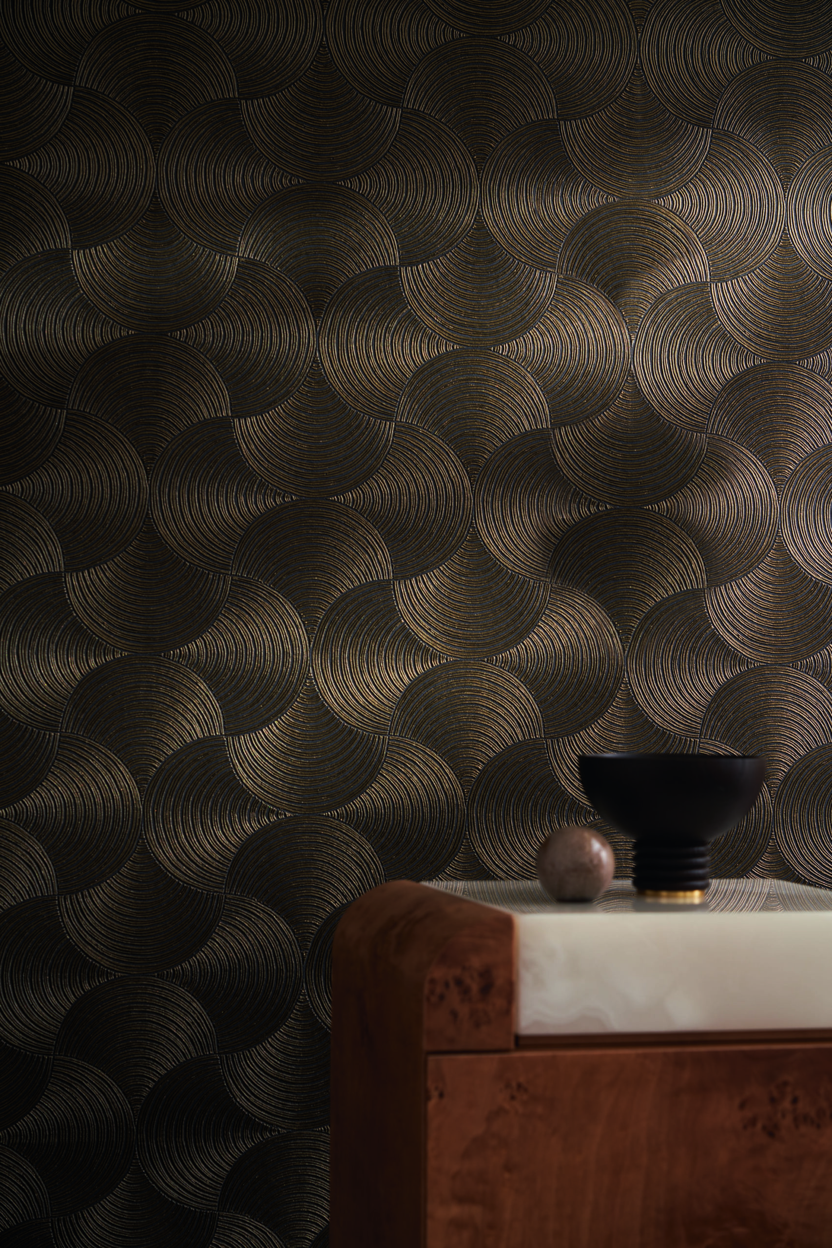 Un cuerpo celeste atraviesa el cielo nocturno y lo ilumina con su estela. METEORE retoma el motivo de APHELIE, evocando las circunvoluciones de la tierra alrededor del sol. METEORE resulta de una base lisa y mate, disponible en cuatro colores, sobre la que se ha depositado una tinta dorada que marca las crestas de la textura en un acabado muy lujoso.