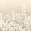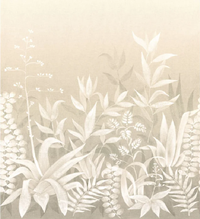Es un jardín mediterráneo donde los agaves y aloes responden a la ligereza de las hierbas. Sobre un lienzo de lino en tonos degradados, las siluetas vegetales cobran vida, devolviendo el encanto de Cala Saona, uno de los miradores más bellos de Formentera. Esta panorámica atemporal fue pintada a mano por nuestro estudio de diseño y reproduce hermosos efectos materiales.