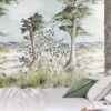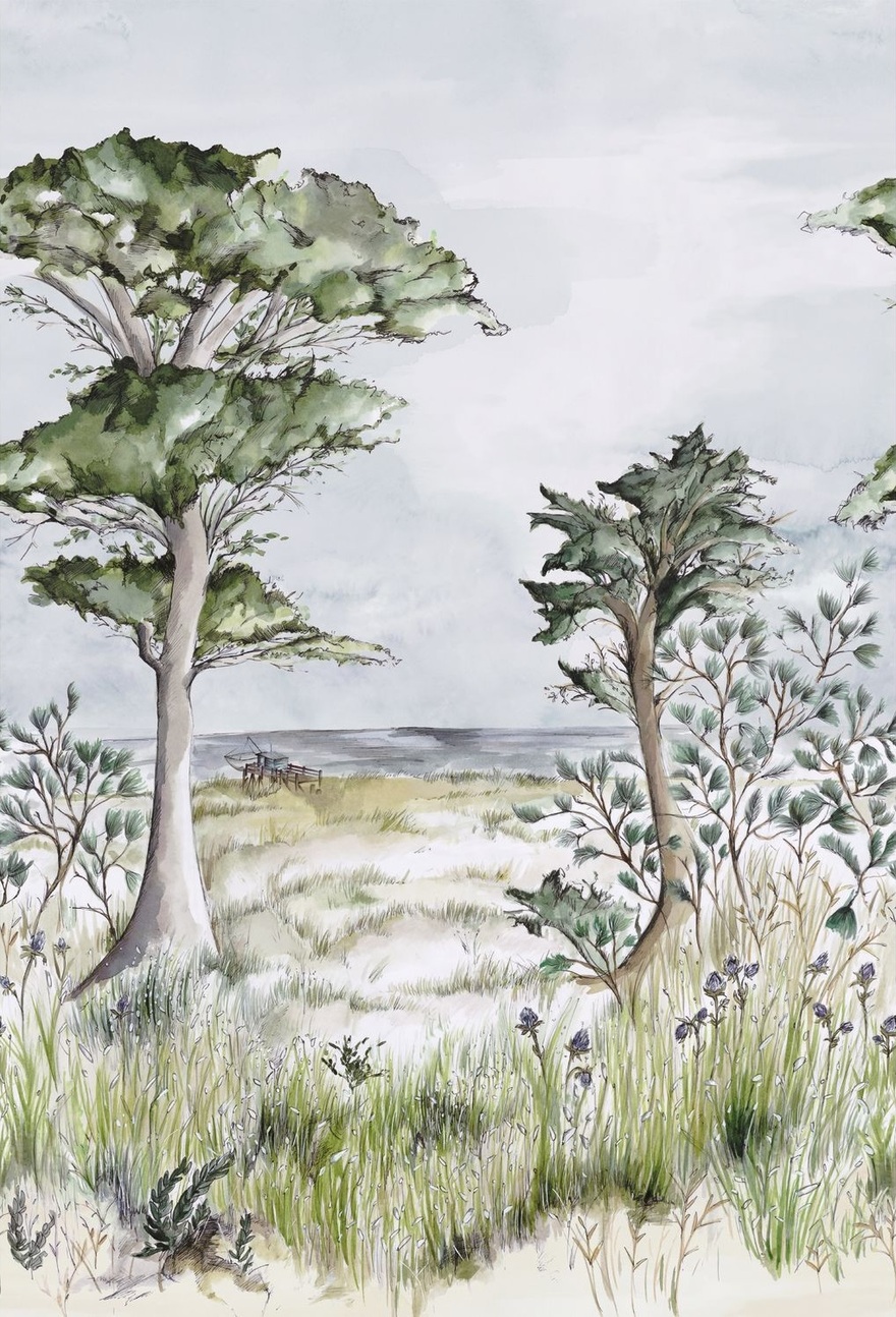 Pastos silvestres, arena y pino piñonero, una cabaña de pescadores sobre pilotes, conectada a tierra por un pontón… Realizada con tintas de colores.