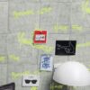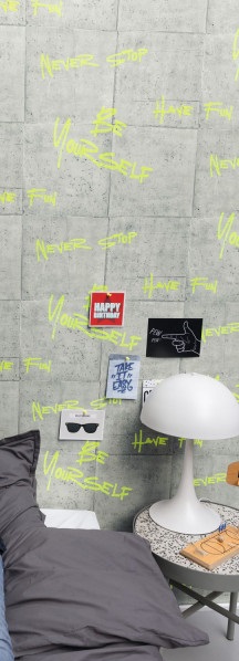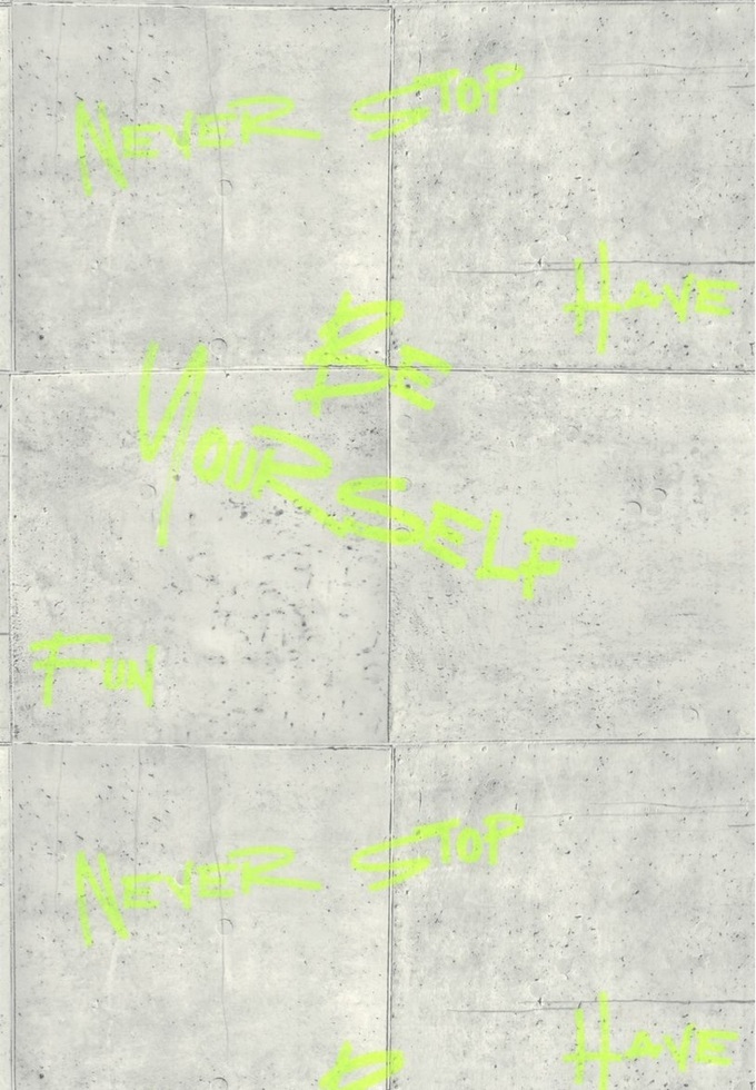 La calle llega a la decoración con divertidas palabras sobre una pared industrial con la técnica fluorescente.